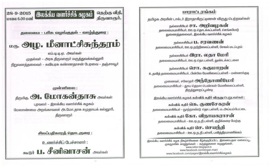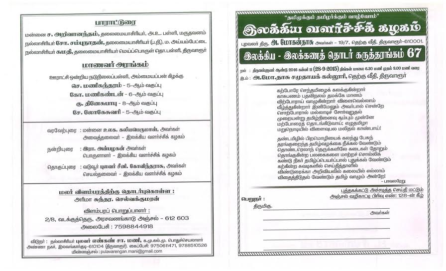 இலக்கிய இலக்கணத்தொடர் கருத்தரங்கம் 67 இலக்குவனார் திருவள்ளுவன் 20 September 2015 No Comment இலக்கிய வளர்ச்சிக் கழகம் திருவாரூர் புரட்டாசி 11, 2046 / செப். 28, 2015 மாலை 6.30 – 9.00 சிலப்பதிகாரத் தொடருரை பாட்டரங்கம் பாராட்டரங்கம் மாணவர் அரங்கம் பரிசரங்கம் Topics: அழைப்பிதழ் Tags: அ.மோகன்தாசு, இலக்கிய வளர்ச்சிக் கழகம், இலக்கிய-இலக்கணத்தொடர் கருத்தரங்கம், எண்கண் சா.மணி, திருவாரூர், ப.சீனிவாசன், மரு.அழ.மீனாட்சிசுந்தரம் Related Posts தொல்காப்பியச் சிறப்புப் பொழிவு – மத்தியப் பல்கலைக்கழகம், திருவாரூர் செம்மொழித்தமிழாய்வு மத்திய நிறுவனத்தின் தனித்தன்மையைக் காத்திடுவோம்! – இலக்குவனார் திருவள்ளுவன் இலக்கிய இலக்கணத் தொடர்கருத்தரங்கம் 84 : இலக்கியவளர்ச்சிக் கழகம், திருவாரூர் இலக்கிய வளர்ச்சிக் கழகம், திருவாரூர் : தொடர் 79 இலக்கிய-இலக்கணத் தொடர் கருத்தரங்கம் 75, திருவாரூர் இலக்கிய-இலக்கணத் தொடர் கருத்தரங்கம் 74, திருவாரூர்