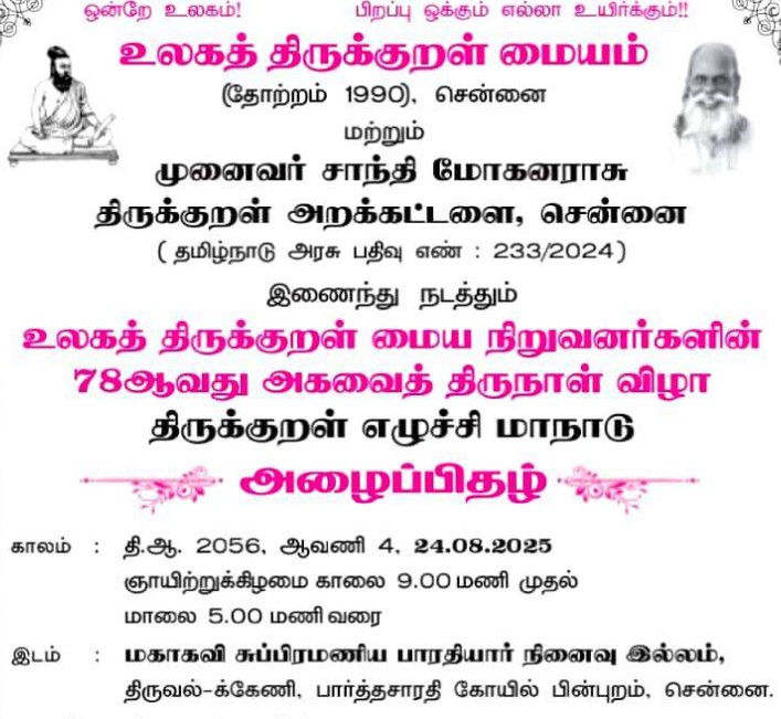 உலகத்திருக்குறள் மையம், திருக்குறள் எழுச்சி மாநாடு, 23.08.2025 இலக்குவனார் திருவள்ளுவன் 23 August 2025 No Comment குறிப்பு: கிரந்தம் தவிர்த்தும் பிழை நீக்கியும் படித்திடுக. Topics: அழைப்பிதழ், இலக்குவனார் திருவள்ளுவன், உரை / சொற்பொழிவு, செய்திகள், திருக்குறள் Tags: Ilakkuvanar Thiruvalluvan, உலகத்திருக்குறள் மையம், திருக்குறள் எழுச்சி மாநாடு, மோகன்ராசு Related Posts வெருளி நோய்கள் 554-558: இலக்குவனார் திருவள்ளுவன் வெருளி நோய்கள் 549-553: இலக்குவனார் திருவள்ளுவன் வெருளி நோய்கள் 544-548: இலக்குவனார் திருவள்ளுவன் குறட் கடலிற் சில துளிகள் 33. இடிக்குந் துணை இருப்போரைக் கெடுப்போர் யாருமிலர்: இலக்குவனார்திருவள்ளுவன் வெருளி நோய்கள் 539-543: இலக்குவனார் திருவள்ளுவன் எண்ணுவோம் தமிழில்! எழுதுவோம் தமிழில்! – 14 : உம்மைத் தொடர்களில் ‘மற்றும்’ தேவையில்லை : இலக்குவனார் திருவள்ளுவன்