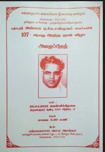 ஒளவை தி.க.சண்முகம் 107ஆவது பிறந்த நாள் விழா இலக்குவனார் திருவள்ளுவன் 25 April 2019 No Comment வைகாசி 13, 2050 வெள்ளி 26.04.2019 மாலை 5.30 உருசியப் பண்பாட்டு மைய அரங்கம், கத்தூரிரங்கன் சாலை, சென்னை 600 018 சங்கரதாசு சுவாமிகள் நினைவு மன்றம் Topics: அழைப்பிதழ், செய்திகள் Tags: ஒளவை தி.க.சண்முகம், தவத்திரு சங்கரதாசு சுவாமிகள், பிறந்த நாள் விழா, விருதுகள் வழங்கல் Related Posts கி.ஆ.பெ.விசுவநாதம் & சி.இலக்குவனார் பிறந்த நாள் விழா காஞ்சி மணிமொழியார் 120ஆவது பிறந்த நாள் விழா ஒளவை தி.க.சண்முகம் பெருமங்கலம் 106, சென்னை 41ஆவது சென்னை புத்தகக் காட்சி தமிழ்க்கூடல், மாதவரம், சென்னை கம்பன் விழா, பிரான்சு