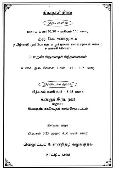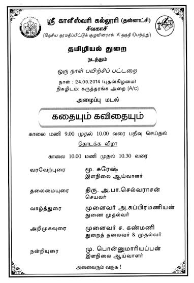 சிரீ காளீசுவரி கல்லூரி, தமிழியல்துறை, பயிற்சிப்பட்டறை இலக்குவனார் திருவள்ளுவன் 21 September 2014 No Comment புரட்டாசி 8, 2045 / 24.09.2014 சிவகாசி கதையும் கவிதையும் சிறுகதைச்சிந்தனைகள் கவிதைக் கண்ணோட்டம் Topics: அழைப்பிதழ் Tags: கதை, கவிதை, சிரீ காளீசுவரி கல்லூரி, தமிழியல் துறை, பயிற்சிப்பட்டறை Related Posts கவிதைக்கான இளம்பிறை விருது, கடைசி நாள் 30.11.2021 மேலை நோக்கில் தமிழ்க்கவிதையைக் காணும் பேரா.ப.மருதநாயகம் (எஏ) குவிகம் இணைய அளவளாவல் – 14.06.2020 குவிகம் இல்லம்: அளவளாவல்: கவிதை குறிஞ்சிக் கபிலர் தமிழ்ச் சங்கத்தின் மாநிலப் போட்டிகள் ‘நான் அறிந்த சுசாதா’ – கலந்துரையாடல்,சென்னை