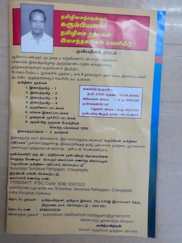சுரும்பியனார் இசைத்தகடுகள் வெளியீடு – முன்பதிவு இலக்குவனார் திருவள்ளுவன் 04 October 2015 No Comment தமிழிசை நூல்கள் 8 இசைத்தகடுகள் 3 தொடர்பு : தமிழ் மகிழ்நன் 92802 53329 [மின்வரி : surumbian.isaithamizh.noolagam@gmail.com] Topics: அழைப்பிதழ் Tags: சுரும்பியனார் இசைத்தகடுகள் வெளியீடு, தமிழிசை நூல்கள், முன்பதிவு Related Posts அடியார்க்கு நல்லார் குறிப்பிடும் சிலத் தமிழிசை நூல்கள் திராவிடர் 100 – முன்பதிவுத் திட்டம்
