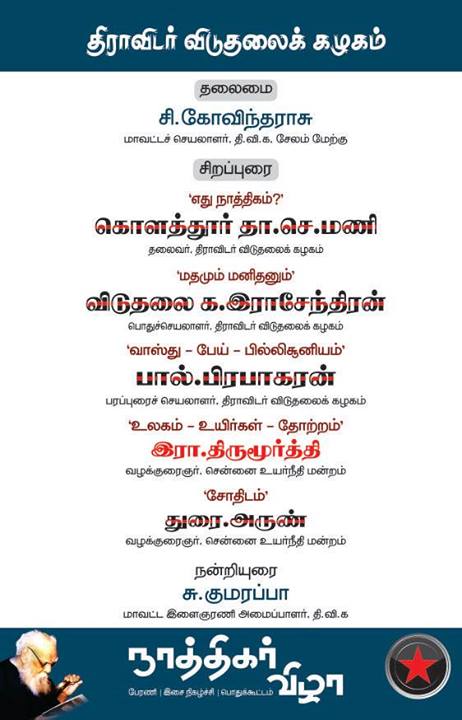 நாத்திகர் விழா , மேட்டூர் இலக்குவனார் திருவள்ளுவன் 03 August 2014 No Comment ஆவணி 7, 2045 / ஆக. 23, 2014 Topics: அழைப்பிதழ் Tags: கொளத்தூர் மணி, திராவிடர் விடுதலைக்கழகம், நாத்திகர் விழா, பள்ளத்தூர் நாவலரசன், பேரணி, மேட்டூர், விடுதலை க.இராசேந்திரன் Related Posts பெரியாரியல் பயிற்சி வகுப்பு, பாலமலை,சேலம் மாவட்டம். இரு நாள் பெரியாரியல் பயிலரங்கம் – பவானி திராவிடம் என்பது ஆரியல்லார் என்பதன் குறியீடு! – குளத்தூர் மணி திராவிடர் விடுதலைக்கழகம் நடத்தும் கொள்கைப் பயிலரங்கம் இருநூல் வெளியீட்டு நிகழ்வு, தியாகராயநகர், சென்னை வாழ்வுரிமை மாநாட்டுப் பேரணி, பொதுக்கூட்டம்