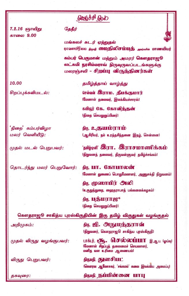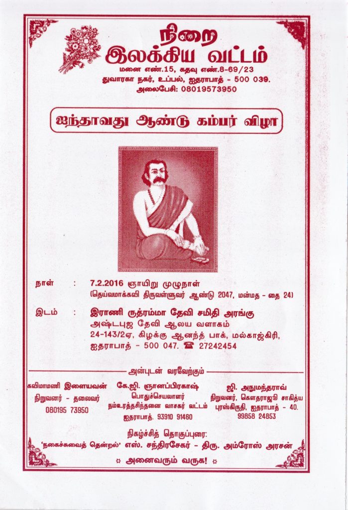 இம்முறை வரும் ஃபிப்ரவரி 7ம் தேதி ஐந்தாவது ஆண்டு கம்பர் விழாவை நிறை அமைப்பு நடத்துகிறது. முழுநாள் விழா.  அழைப்பிதழை இணைத்திருக்கிறேன்.