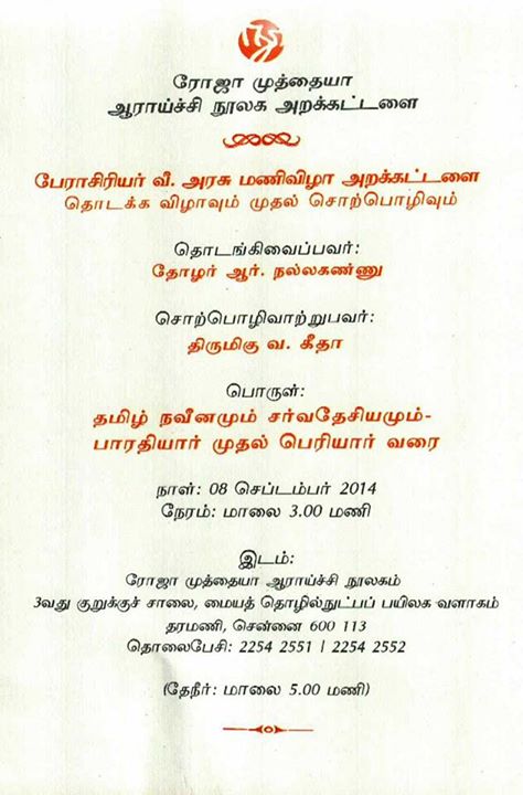 பேரா.வீ.அரசு மணிவிழா அறக்கட்டளை தொடக்க விழா இலக்குவனார் திருவள்ளுவன் 07 September 2014 No Comment ஆவணி 23, 2045(08.09.2014) தொடங்கி வைப்பவர் : தோழர் இரா.நல்லகண்ணு பொழிஞர் : திருமிகு வ.கீதா Topics: அழைப்பிதழ் Tags: இரா.நல்லகண்ணு, தொடர் சொற்பொழிவு, பாரதியார், பெரியார், வ.கீதா, வீ.அரசு மணிவிழா அறக்கட்டளை Related Posts ரு. பெரியார் கூற்றும் தமிழர் நிலையும் – திருத்துறைக்கிழார் 73.சனாதனம் இருப்பதால்தான் கீழோர் எனப்படுவோர் உயர்பதவிகளில் அமர்கின்றனரா? + 74. காலில் பிறந்தவன் சூத்திரன் என்பது எங்ஙனம் இழிவு படுத்துவதாகும் என்கிறார்களே! + 75. திமுக, சனாதன ஒழிப்பு பேசுவது வேடிக்கையாக உள்ளது” – எடப்பாடி பழனிசாமி – பொய்யும் மெய்யும்: இலக்குவனார் திருவள்ளுவன் நான்கு வருணத்தவருக்கும் பூணூல் உண்டு. சரியா? – இலக்குவனார் திருவள்ளுவன் சனாதனத்தின்படிப், பூணூல் பிறரும் போடலாம்; போடுகிறார்கள் என்கின்றனரே! – இலக்குவனார் திருவள்ளுவன் வருணங்கள், பிறப்பால் அமைக்கப்பட்டவை இல்லை . அவரவர் செய்யும் தொழிலால் வகுக்கப்பட்டவை என்பது சரியா? – இலக்குவனார் திருவள்ளுவன் மொழிப்போர் வரலாறு அறிவோம்!-10 : மொழிப்போரில் மகளி்ர் பங்களிப்பு – 1