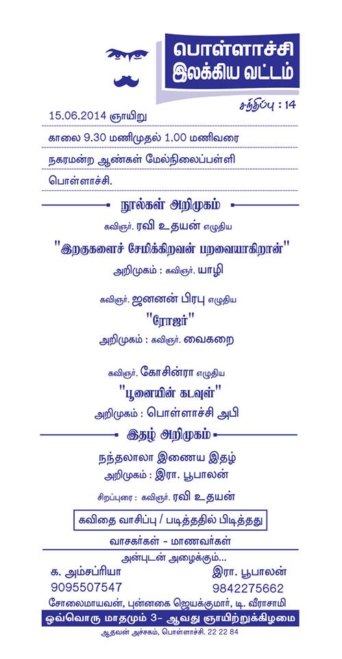 பொள்ளாச்சி இலக்கிய வட்டம்-சந்திப்பு 14 இலக்குவனார் திருவள்ளுவன் 15 June 2014 No Comment Topics: அழைப்பிதழ் Tags: அழைப்பிதழ், சந்திப்பு 14, பொள்ளாச்சி இலக்கிய வட்டம் Related Posts மொழிப்போர் ஈகியர் வீரவணக்க நிகழ்வு,பொள்ளாச்சி ஈழமும் பன்னாட்டுச் சதிகளும் – ஈரோட்டிலும் கோபியிலும் கருத்தரங்கம் தீ இனிது : சொற்கள் அலறும் காலம் என்றென்றும் வள்ளலார் – பொறி.பக்தவத்சலம் உரை திராவிட இயக்க வளர்நலப் பெரியோர்கள் பிறந்தநாள் விழா பயன்பாட்டுப் பார்வையில் துறைதோறும் தமிழ் – பன்னாட்டுக் கருத்தரங்கம்