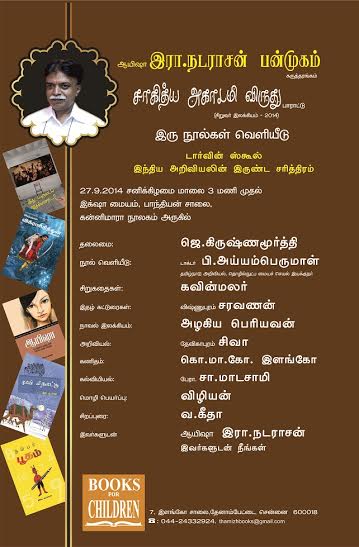 கடந்த 30 ஆண்டுகளுக்கு மேலாகத் தமிழ்ப்படைப்புத்துறையில் தொடர்ந்து இயங்கிவரும் எழுத்தாளர் ஆயிசா நடராசன் அவர்களுக்கு 2014 ஆம் ஆண்டுக்கான சிறுவர் இலக்கியத்திற்காக சாகித்ய அகாதமி விருது அறிவிக்கப்பட்டுள்ளது. இதனைக் கொண்டாடும் விதமாக அவரது படைப்புகள் குறித்து ஆய்வரங்கம் நடைபெற உள்ளது. தங்கள் வருகையை எதிர்பார்ககிறோம்