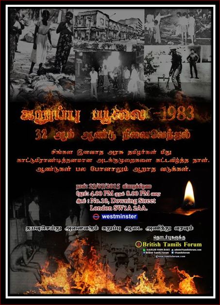 1983 ஆம் ஆண்டு சூலை மாதம் 23 ஆம் நாள் இலங்கையின் சிங்களப் பேரினவாத அரசினால் தமிழ் மக்களுக்கெதிராக கட்டவிழ்த்து விடப்பட்ட இனப்படுகொலையின் 32 ஆம் ஆண்டு நினைவு நாளை முன்னிட்டு ஒரு மாபெரும் நினைவேந்தல் மற்றும் ஆர்ப்பாட்ட நிகழ்வொன்றினை, எதிர்வரும் ஆடி 07, 2046 / சூலை மாதம் 23 ஆம் நாள் பிற்பகல் 4 மணியிலிருந்து 8 மணிவரை, பிரித்தானியத்தலைமையமைச்சரின் அலுவல்முறை வதிவிடமான 10, தவுனிங்கு தெரு(Downing Street) முன்பாகப் பிரித்தானியத் தமிழர் பேரவை ஏற்பாடு செய்துள்ளது.
