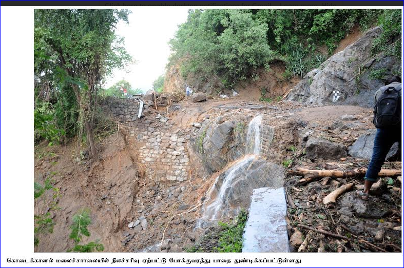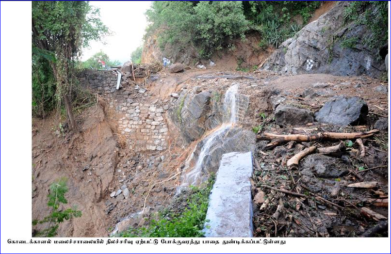 மேலும் கடந்த சில ஆண்டுகளாக இப்பகுதியில் மழை பொழியாததால் ஆழ்துளைக்கிணறுகளுக்காகத் துளைபோட்டும் பாறைகள் எடுப்பதற்கும் வீடுகள் கட்டுவதற்கும் அடுக்குமாடி குடியிருப்புகள் கட்டுவதற்கும் பாறைகள் வெடிவைத்து தகர்க்கப்பட்டு வருகின்றன.. இவைதவிர மலைக்கு அரணாக இருந்த மரங்கள் ஏராளமாக வெட்டி கடத்தப்பட்டுவிட்டன. இதனால் சாலைகளில் மண்சரிவுகள் ஏற்படுகின்றன. பத்துக்கும்மேற்பட்ட இடங்களில் சாலைகள் அரிக்கப்பட்டுள்ளதால் போக்குவரத்து பாதிப்படைந்துள்ளது. இதனால் மலைச்சாலை அருகே காவல்துறையினர் கொடைக்கானல் செல்லும் வாகனங்களை மாற்றுவழியில் திருப்பிவிடுகின்றனர்.