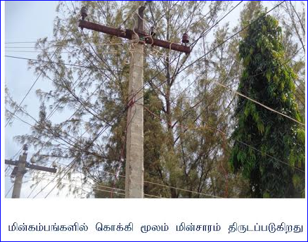 கொக்கிபோட்டு மின்சாரம் திருடப்படுவது அப்பகுதியில் பணிபுரியும் மின்வாரிய ஊழியர்கள் உடந்தையுடன் நடைபெறுகிறது.