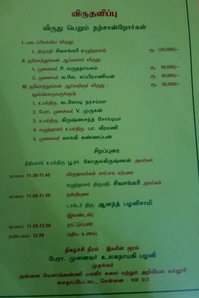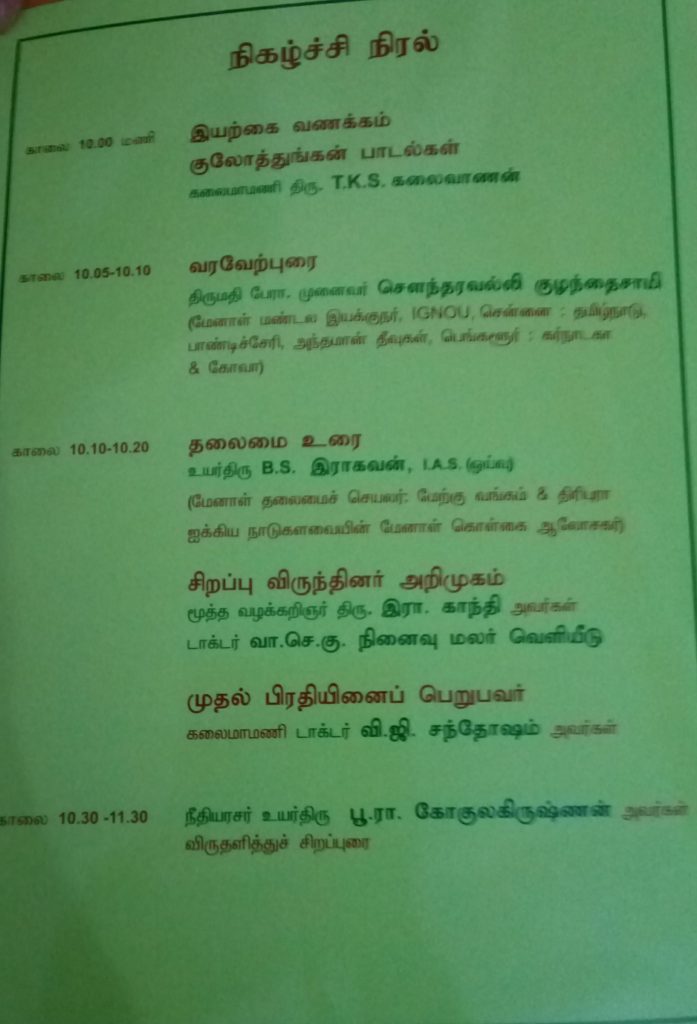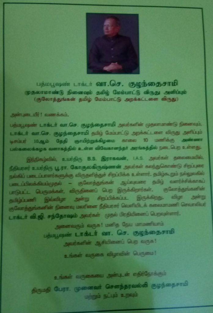 வா.செ.குழந்தைசாமி நினைவேந்தலும் தமிழ் மேம்பாட்டு விருது அளிப்பும் இலக்குவனார் திருவள்ளுவன் 10 December 2017 No Comment ஞாயிற்றுக்கிழமை 10.12.2017 காலை 10.00 விவேகானந்தர் அரங்கம், அண்ணா பல்கலைக்கழகம் முனைவர் வா.செ.குழந்தைசாமி முதலாமாண்டு நினைவும் குலோத்துங்கன் தமிழ் மேம்பாட்டு அறக்கட்டளை விருது அளிப்பும் Topics: அழைப்பிதழ், செய்திகள் Tags: தமிழ் மேம்பாட்டு விருது அளிப்பும், வா.செ.குழந்தைசாமி நினைவேந்தல் Related Posts தமிழ் மேம்பாட்டு விருது வழங்கு விழா, கரூர்