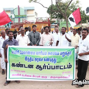 திருநெல்வேலியில், பாளைச் சந்தைத்திடலில் நடைபெற்ற ஆர்ப்பாட்டத்திற்கு, தமிழ்த் தேசப் பொதுவுடைமைக் கட்சி பொதுக்குழு உறுப்பினர் தோழர் க.பாண்டியன் தலைமையேற்றார். இந்தியப் பொதுவுடைமைக்கட்சி மாவட்டத் துணைச் செயலாளர் தோழர் காசி விசுவநாதன், தமிழ்த் தேசப் பொதுவுடைமைக் கட்சி திருச்செந்தூர் செயலாளர் தோழர் மு.தமிழ்மணி, ஆதித்தமிழர் பேரவை மாவட்டச் செயலாளர் தோழர் கலைக்கண்ணன், மே பதினேழு இயக்க ஒருங்கிணைப்பாளர் தோழர் லெனா.குமார், இந்தியப் புகழ்நிலையர் முன்னணி(பாப்புலர் பிரண்ட் ஆப் இந்தியா) மாவட்டத் தலைவர் திரு. எசு.அகமது நவபி, தமிழக ஒடுக்கப்பட்டோர் விடுதலை இயக்கப் பொறுப்பாளர் தோழர் கபிலன், மத்திய மாநில  அ.சா./ அ.ப. (SC/ST) அரசு ஊழியர் சங்கம் திரு.அரிராம், திராவிடர் விடுதலைக் கழகக் கொள்கைப் பரப்புரைச் செயலாளர் தோழர் பால்.பிரபாகரன், உழைக்கும் மக்கள் விடுதலை இயக்கம் தென் மாவட்ட அமைப்பாளர் தோழர் நல்வினைச் செல்வன், புரட்சிகர இளைஞர் முன்னணி மாவட்ட அமைப்பாளர் தோழர் இ.உத்திரம், அம்பேத்கர் நினைவு சமுதாய பணி இயக்க அமைப்பாளர் தோழர் பொற்செழியன், பாலச்சந்திரன் மாணவர் இயக்கத் தோழர் பன்னீர் செல்வம், இந்தியக் கம்யூனிஸ்ட் கட்சி விவசாயிகள் சங்க மாவட்டச் செயலாளர் கசமுத்து, பாவாணர் இயக்கம் திரு. தென்.து.மூக்கையா ஆகியோர் கண்டன உரை நிகழ்த்தினர்.