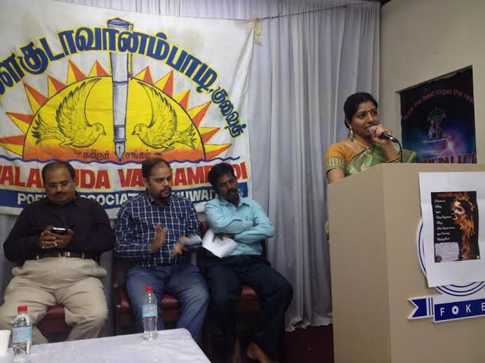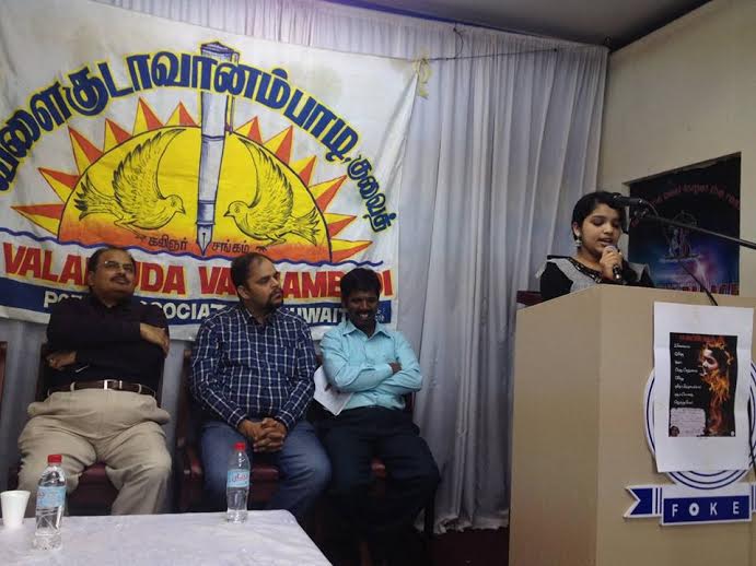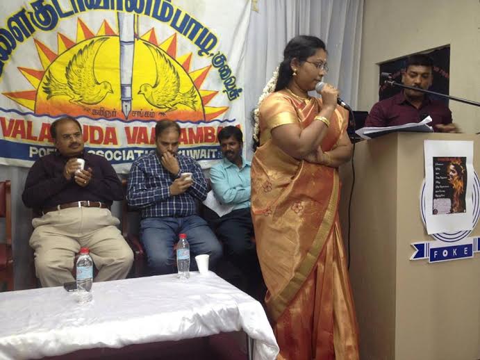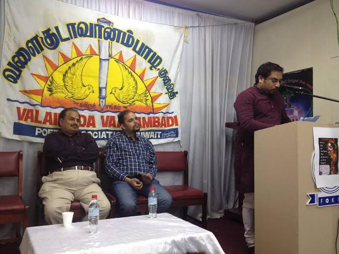 valaikuta vanambadi12 valaikuta vanambadi13  குவைத்து வளைகுடா வானம்பாடிகளின் திங்கள் கூட்டம் 14-03-2014 வெள்ளி அன்று மிகச் சிறப்பாக, தோழர் செங்கொடி அரங்கத்தில் நடைபெற்றது. நிகழ்ச்சியை வானம்பாடி நிறுவனர் திரு சேது அவர்கள் தொடங்கி வைக்க, தமிழ்த்தாய் வாழ்த்துடன்  தொடங்கியது. செல்வி அனு,  திருக்குறள்களைத் தன் மழலை மொழியால் வழங்க, நிகழ்ச்சி இனிதே  களைகட்டியது. நிகழ்ச்சிக்கு ”அரவணைப்பு” திரு இளங்கோவன், தொழிலதிபர் திரு சாமி, வானம்பாடிகள் உதவித் தலைவர் திரு அலெக்சு ஆகியோர் தலைமை வகித்தனர்.