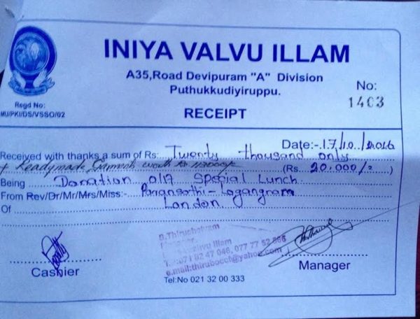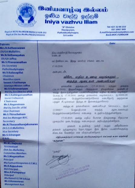 எமது புலம்பெயர் உறவான இலண்டனைச் சேர்ந்த பரஞ்சோதிஉலோகஞானம், தன் தந்தை பரஞ்சோதி (17.10.2016), தங்கை இராசேசுவரி (16.10.2016) பிறந்த நாள்களை முன்னிட்டு முல்லைத்தீவு மாவட்டத்திலுள்ள விழிப்புலனற்ற, சிறப்புத் தேவைக்குரிய இனிய வாழ்வு இல்ல மாணவர்களுக்குச் சிறப்பு நண்பகல் உணவினை வழங்கி வைத்துள்ளதுடன். தீபாவளி நாளினை முன்னிட்டு இல்ல மாணவர்களுக்கு ஏறத்தாழ 1,13,000 உரூபா பெறுமதியான புத்தாடைகளையும் வட்டு இந்து வாலிபர் சங்கத்தினுடாக அன்பளிப்பாக வழங்கியுள்ளர்.
